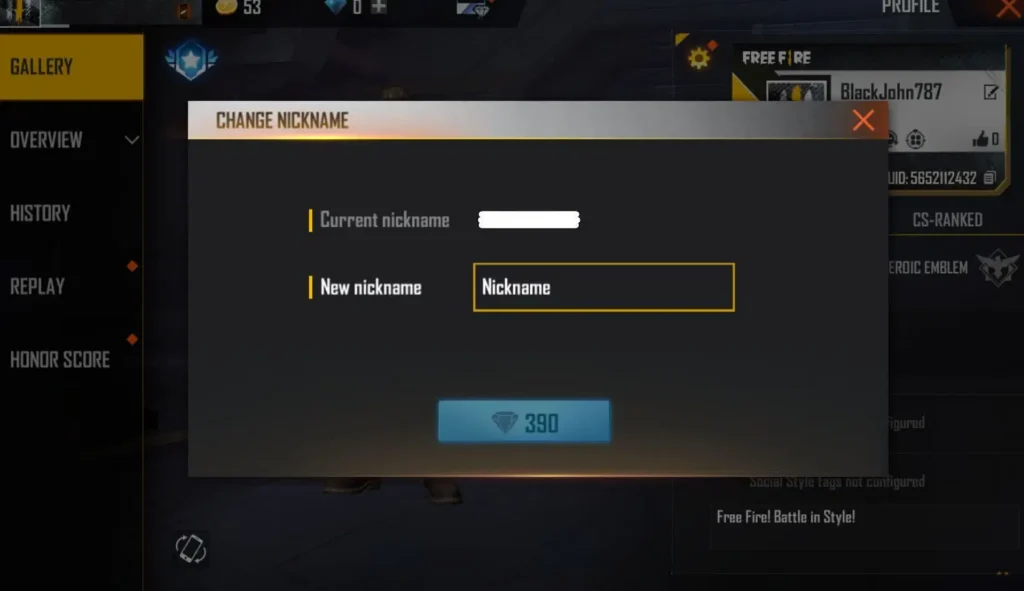 In the text field, type your new Free Fire username. You can include stylish fonts or symbols like â™›, äş—, đź‘‘ to personalize it.